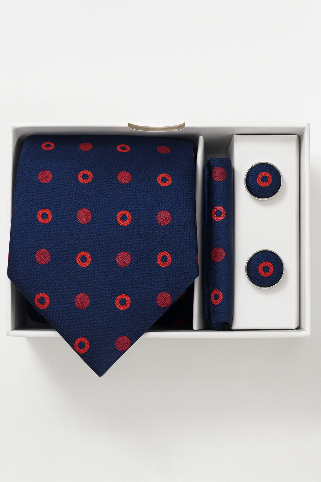 Set de corbata de tres piezas compuesto por corbata elaborada en 80% seda y 20% poliéster.