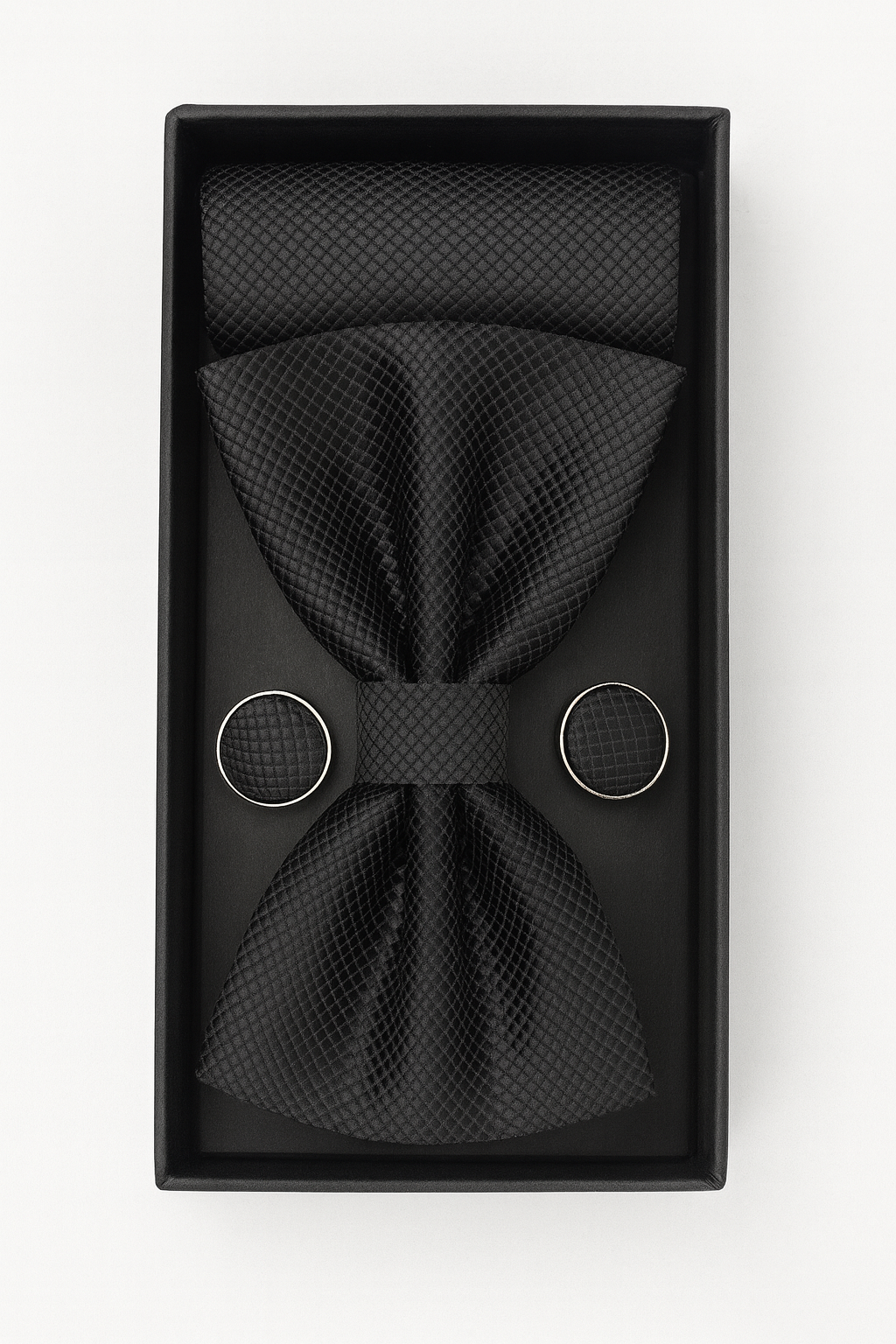 Set de corbata de tres piezas compuesto por corbata elaborada en 80% seda y 20% poliéster.