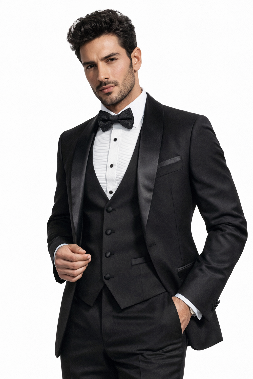Lúcete en este moderno Smoking Slim Fit de 3 piezas, ideal para galas, bodas y eventos de etiqueta.